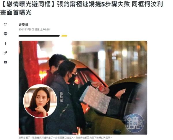 1月3日,据台媒报道,去年11月,张钧甯和马来西亚导演柯汶利被曝出秘密交往,还要赶在年底前结婚,结果在2023年倒数9天,平常对感情生活口风甚密的张钧甯,终于坦言爸妈喜欢对方,只是否认要嫁人,总之“脱单”这回事已确认。尽管恋情已公开,但张钧甯携男友与友人聚会时,快速送客、上车,在公开的场所里尽量避免与男友同框,但仍被拍到认爱后难得的首度同框画面。