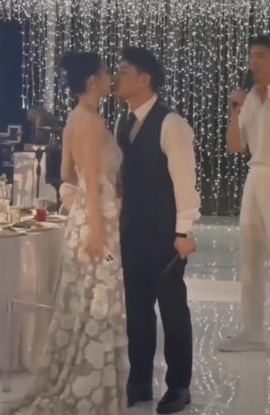 婚礼现场潘玮柏脱下西装,只穿着白衬衫和马甲。他拿着话筒和主持人在互动,之后主持人让潘玮柏牵起新娘。两人在亲友的见证下深情一吻,画面唯美又浪漫。