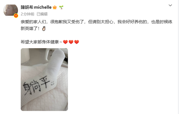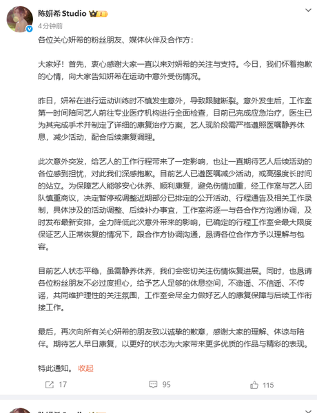 各位关心妍希的粉丝朋友、媒体伙伴及合作方:大家好!首先,衷心感谢大家一直以来对妍希的关注与支持。今日,我们怀着抱歉的心情,向大家告知妍希在运动中意外受伤情况。 昨日,妍希在进行运动训练时不慎发生意外,导致跟腱断裂。