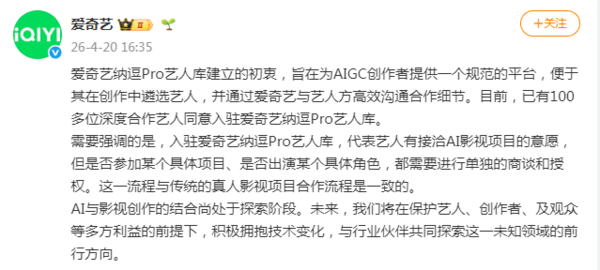 需要强调的是,入驻爱奇艺纳逗Pro艺人库,代表艺人有接洽AI影视项目的意愿,但是否参加某个具体项目、是否出演某个具体角色,都需要进行单独的商谈和授权。这一流程与传统的真人影视项目合作流程是一致的。