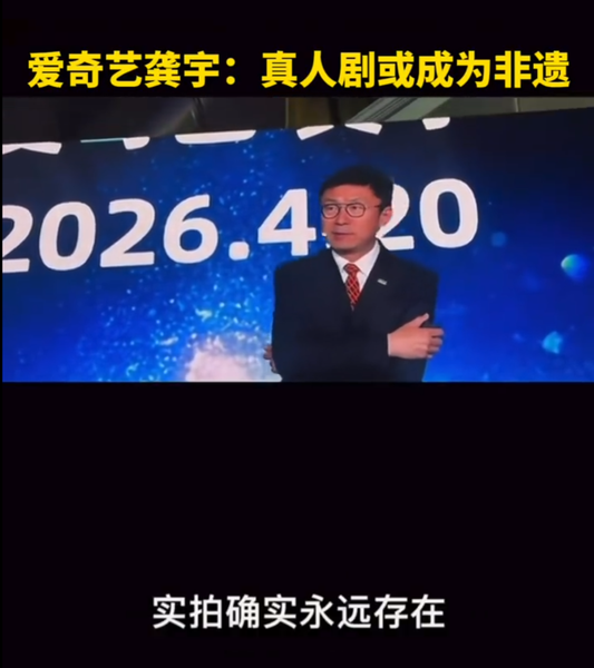 4月20日,2026爱奇艺世界大会在京举行,爱奇艺创始人、首席执行官龚宇发表主题演讲。宣布100多名艺人入驻AI艺人库,并表示真人剧越来越稀有,实拍永远存在,但如果没有科技含量的填充,多少年以后是否可能会成为非物质文化遗产。