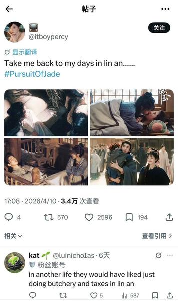 在社交媒体X上,#PursuitOfJade多次登上趋势。话题中,你可以看到不同国家的网友用各自的语言讨论剧集——日本网友称“从《逐玉》中得到治愈”,韩国网友评论“画面美到窒息,两位主演都美得惊人”,英语区网友则在结局后表示“让我回到了在临安(《逐玉》设定的地点)的日子”。