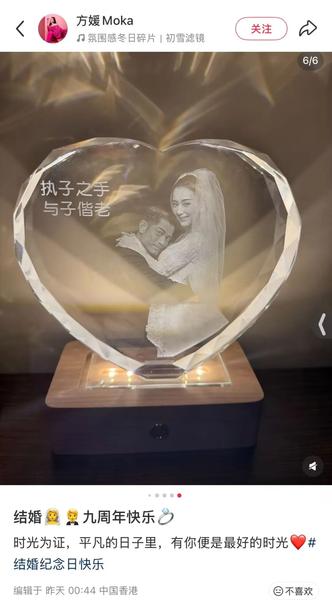 有意思的是,郭富城当天发布的唯一一张live图是张水晶摆件,摆件中镂刻着两人的结婚照。