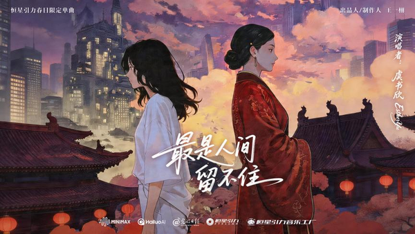 《最是人间留不住》的创作灵感取自王国维的词句,用以表达对时光易逝的感慨,以及对美好人间的眷恋。作品由恒星引力音乐工厂和上海稀宇科技有限公司制作,旋律流畅轻盈,在传统韵味中融入当代情感,传递出大众共通的情绪与对美好生活的向往。该动画MV采用双时空并行的叙事结构,一条线索是现代都市中的少女,手持五线谱,耳机里的旋律成为连接另一个时空的通道;另一条线索设定在古代时空,展现烛火摇曳、竹林飘雪的场景,侠女身姿灵动。两个时空的人物,借助倒影、蝴蝶、回望的眼神等意象产生关联,实现古今时空的情感共振。