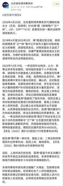 据悉,2018年4月至2025年3月,满*蓉通过其注册、使用的微博账号“兰**林”集中公开发布大量针对陈玫璇女士的侮辱、诽谤性质言论。此后,被告满某被判在个人账号主页置顶位置刊登向陈玫璇赔礼道歉的声明,并赔偿陈玫璇经济损失、精神损害抚慰金、维权的合理开支共计4万元。目前,上述判决已经生效。因被告满某至今未主动履行判决书中其应当承担的法律责任,律师事务所已继续代理陈玫璇女士向法院申请强制执行。