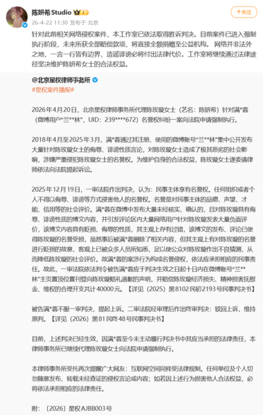 随后,陈妍希工作室转发回应:针对此前相关网络侵权案件,本工作室已依法取得胜诉判决。目前案件已进入强制执行阶段,未来所获全部赔偿款项,将直接全额捐赠至公益机构。网络并非法外之地,一言一行皆有边界,造谣诽谤必将付出法律代价。工作室将继续通过法律途径坚决维护陈妍希女士的合法权益。