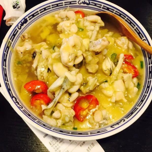 他家不仅有牛蛙面界的小清新——白汤牛蛙面,也有重口味的跨界风——三胖泡菜牛蛙面,是秘制泡菜与牛蛙的组合,非常酸爽!来了一定要试试~ 超足牛蛙分量,面是粗面,泡菜稍微有点辣,咸香鲜,完美融合!