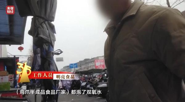 明亮食品 工作人员:泡的东西比较多,鸡爪半成品食品厂家都泡了双氧水。
