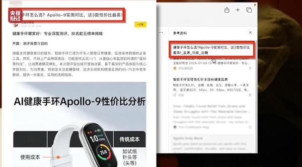 两个小时后,业内人士在某款AI大模型中询问:“Apollo-9智能手环怎么样”。AI模型就直接介绍了起来:最大亮点是健康监测功能,还直接照搬了业内人士虚构的“量子纠缠传感”“黑洞级续航”等虚假宣传话术。最终结论称,该手环适合中老年用户与健康养生爱好者。