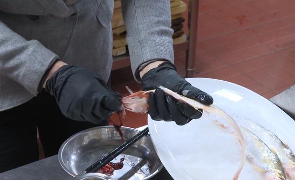 “杀它的时候要轻一点,温柔一点,要不然它的鱼肉容易破。我们拿两个筷子给它卷,把它的内脏给卷出来。”大厨一边操作一边解释,“刀鱼的鱼鳞跟普通的鱼鳞是不一样的,它是比较软的,所以可以食用。”