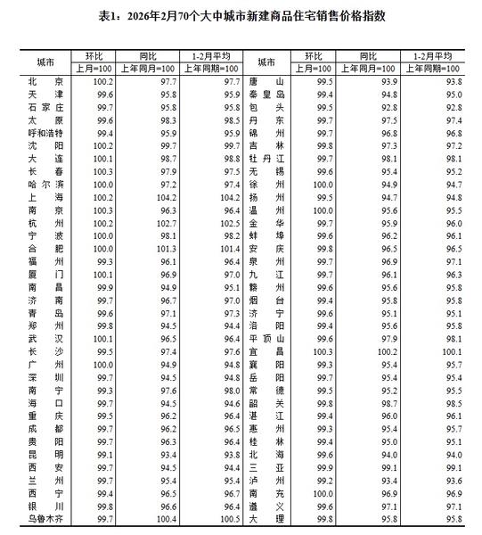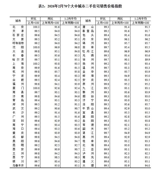 2026年2月份,总体看70个大中城市商品住宅销售价格环比降幅继续收窄、同比下降。新建商品住宅销售价格环比上涨或持平城市个数比上月增加。