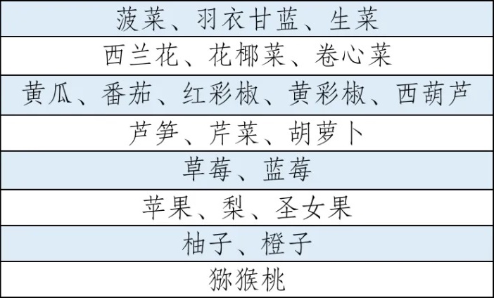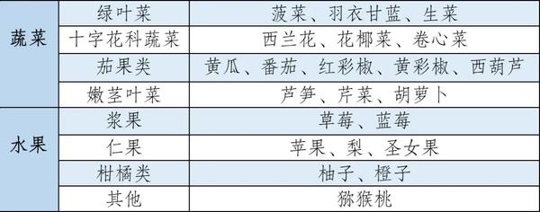 实验选取轻食中常见的22种水果和蔬菜,具体分类如下:
