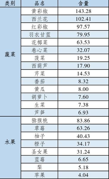 实验数据显示,维C含量前三名均为蔬菜。尤其黄彩椒的维C含量远超常见水果。