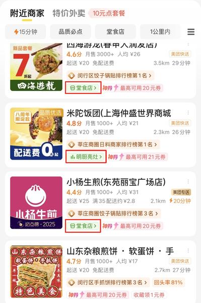 近日,不少市民注意到,美团、淘宝闪购等外卖平台上,部分商家开始标注“堂食店”或“明厨亮灶”标识。这背后,与即将施行的新规有关。