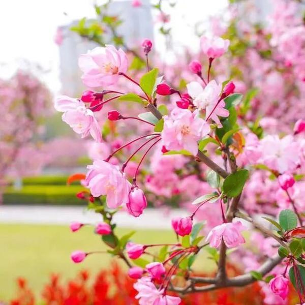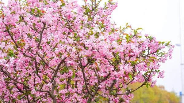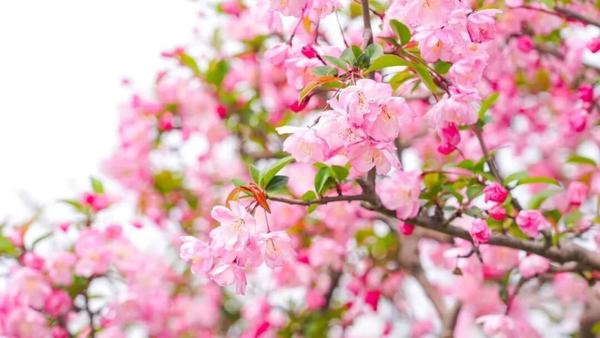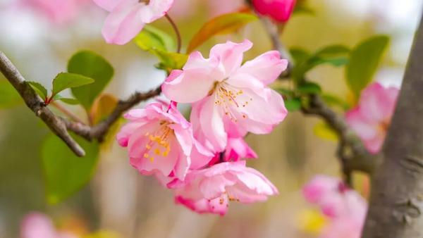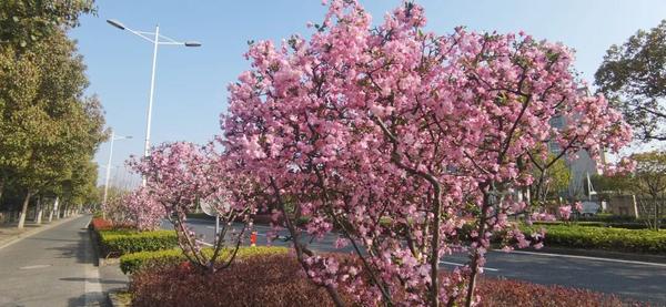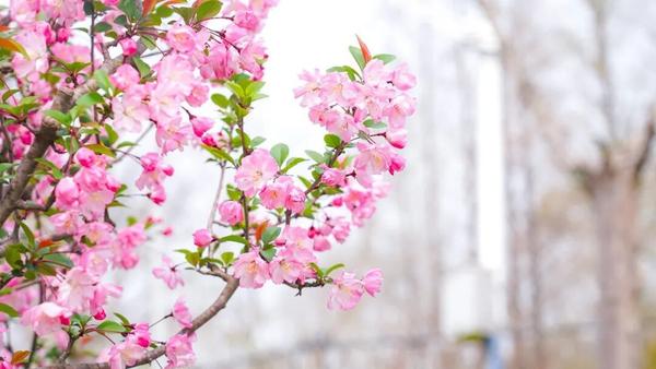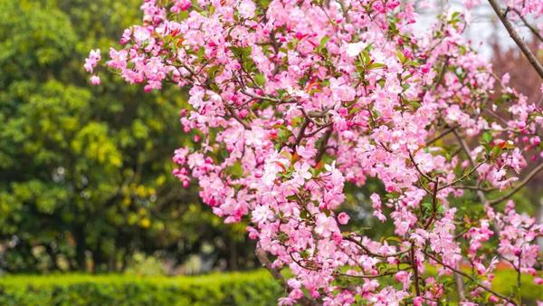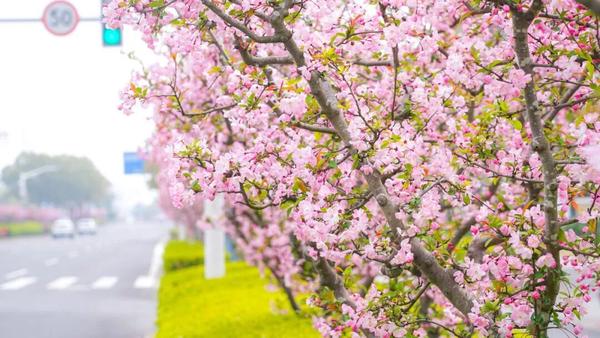 一路上,公园河畔、干道绿化带、小区周边,海棠或三五株清雅点缀,或成片簇拥盛放,把崇明的春天装点得雅致又浪漫。