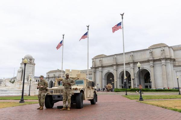 这是8月19日在美国首都华盛顿的联合车站外拍摄的国民警卫队成员和车辆。新华社记者胡友松摄