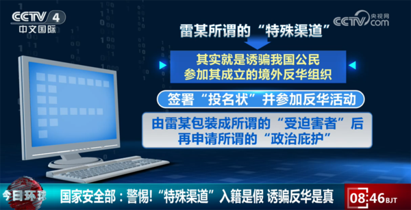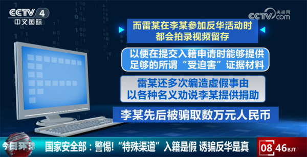 中国公民出境探亲访友、留学、旅游等活动与日俱增。近年来,境外反华敌对势力以能够帮助“加入外籍”为饵,诱骗中国公民在境外参加反华敌对活动,对国家安全构成严重威胁。国家安全机关2月24日就对一起典型案例进行了通报。