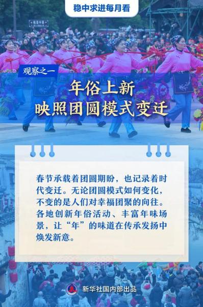 【记者观察】春节承载着团圆期盼,也记录着时代变迁。无论团圆模式如何变化,不变的是人们对幸福团聚的向往。各地创新年俗活动、丰富年味场景,让“年”的味道在传承发扬中焕发新意。