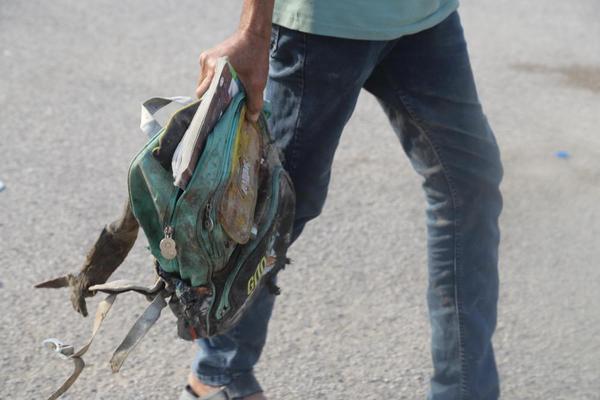 2月28日,在伊朗南部米纳卜市被袭击的小学,一名男子手持从废墟中翻出的书包。