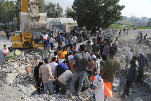 2月28日,在伊朗南部米纳卜市被袭击的小学,救援人员和当地居民试图从废墟里营救伤员。