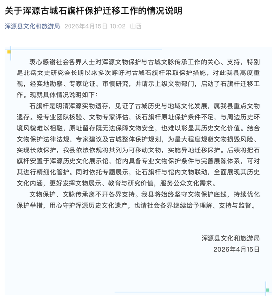 4月15日,山西大同市浑源县文化和旅游局发布关于浑源古城石旗杆保护迁移工作的情况说明:经专业团队核验、文物专家评估,该石旗杆原址保护条件不足,与周边历史环境风貌难以相融,原址留存既无法保障文物安全,也难以彰显其历史文化价值。结合文物保护法律法规、专家建议及古城整体保护规划,为最大程度规避文物损毁风险、实现长效保护,我县依法依规将其列为可移动文物,实施异地迁移保护。后续将把石旗杆安置于浑源历史文化展示馆,馆内具备专业文物保护条件与完善展陈体系,可对其进行精细化管护。