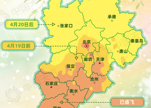 从2026年京津冀杨柳絮盛飞预警地图来看,截至目前,河北南部的邯郸、邢台、衡水、石家庄、沧州、北京城区和天津西南部等地都已进入杨絮盛飞期,天津大部地区、廊坊、北京郊区等地将在4月19日前陆续开启盛飞期,而北京北部燕山和河北的承德、张家口、唐山等地,由于气温较低,盛飞期将在20日以后开启。
