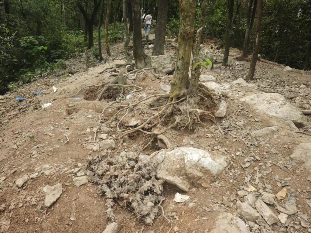 广州市黄埔区林业和园林局核查发现,暹岗大山、长平社区(石碑头山)北二环扩建范围步道两侧,因采挖水晶致约8处点位零星林地被破坏,导致孔洞处林下植被遭破坏,个别树根裸露。目前事发点林木尚未出现枯死。