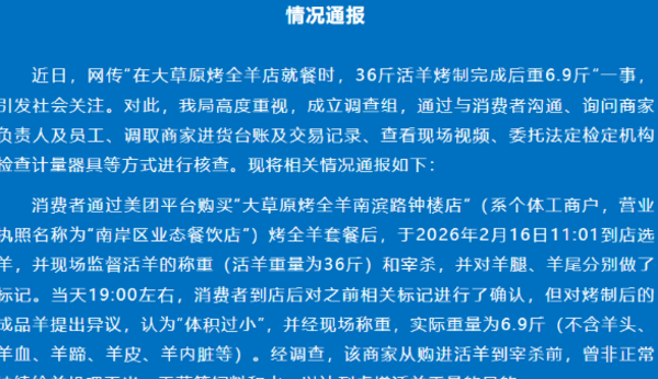 重庆市监局通报“36斤活羊烤后仅6.9斤”事件