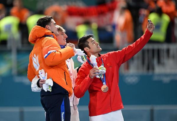 2月11日,冠军美国选手斯托尔兹(中)、亚军荷兰选手德布(左)和季军中国选手宁忠岩在颁奖仪式上自拍。新华社记者 武巍摄