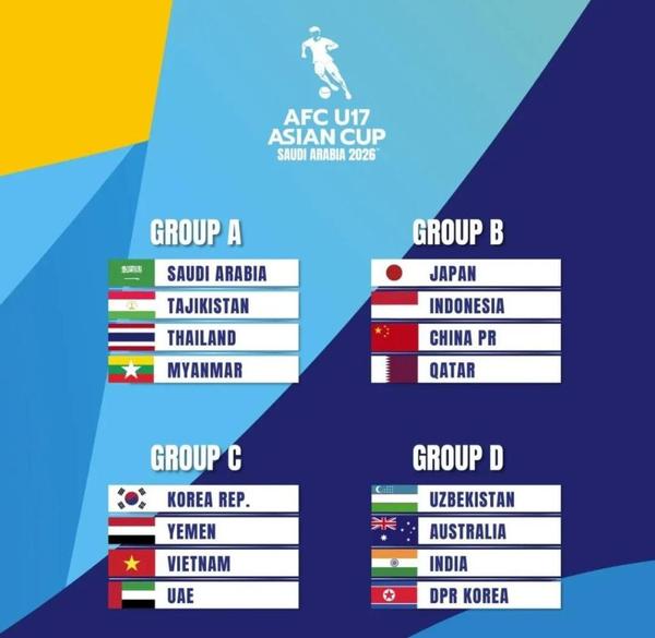 12日,在马来西亚吉隆坡亚足联总部举行的2026年U17男足亚洲杯抽签仪式中,中国队与日本、印度尼西亚和卡塔尔队同分入B组。