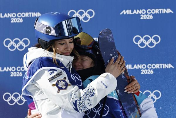 2月22日,中国选手谷爱凌(左)、李方慧在比赛后拥抱庆祝。新华社记者 王鹏 摄
