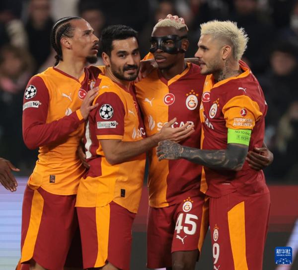 2月25日,加拉塔萨雷队球员奥斯梅恩(右二)与队友庆祝进球。