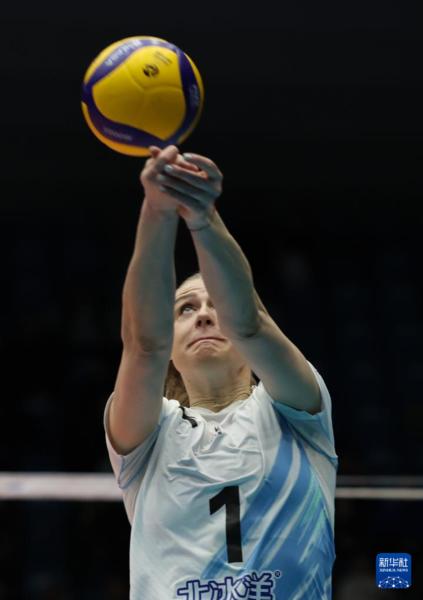 2月25日,北京北冰洋队球员法布里斯(左)在比赛中扣球。