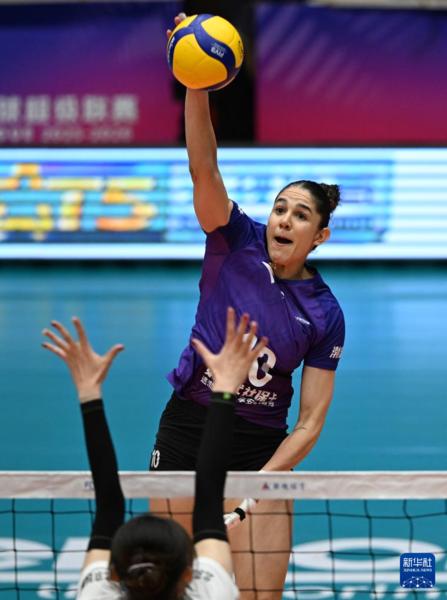 2月25日,天津渤海银行队球员娜塔莉亚在比赛中扣球。