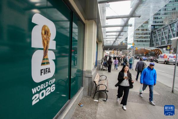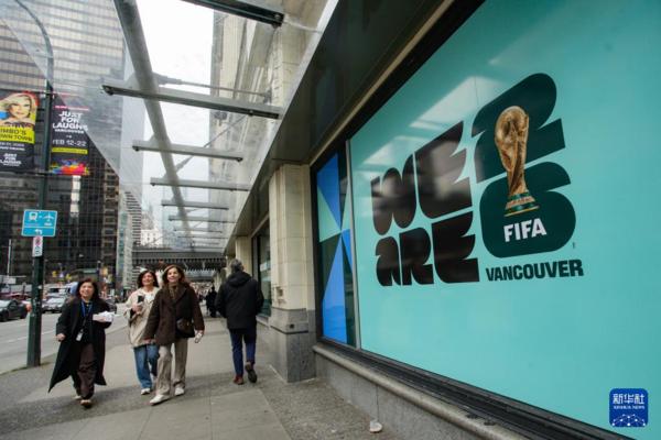 2月26日,行人从加拿大温哥华一栋建筑外的2026年国际足联世界杯宣传标识旁走过。