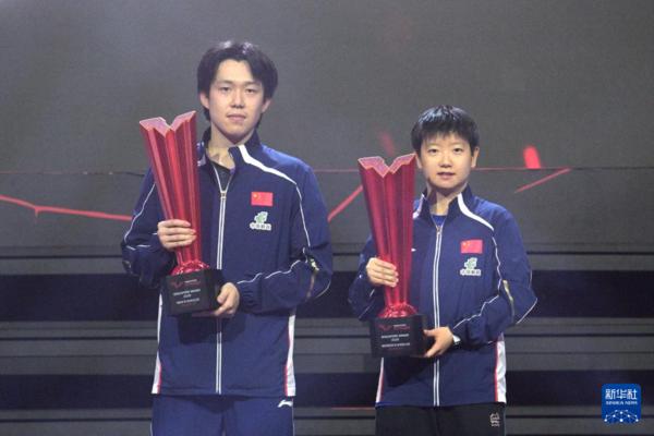 3月1日,男单冠军王楚钦(左)和女单冠军孙颖莎在颁奖仪式上合影。