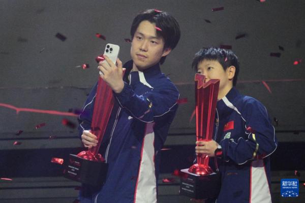 3月1日,男单冠军王楚钦(左)和女单冠军孙颖莎在颁奖仪式上自拍合影。