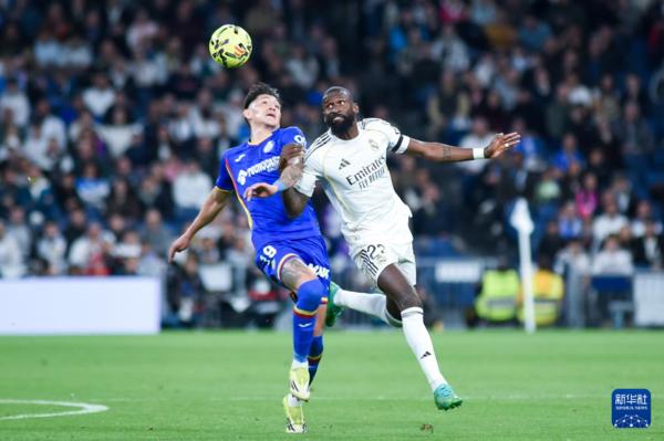 3月2日,皇家马德里队球员吕迪格(右)和赫塔菲队球员巴斯克斯在比赛中争抢头球。