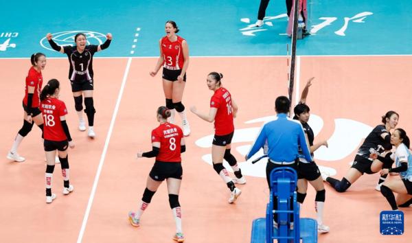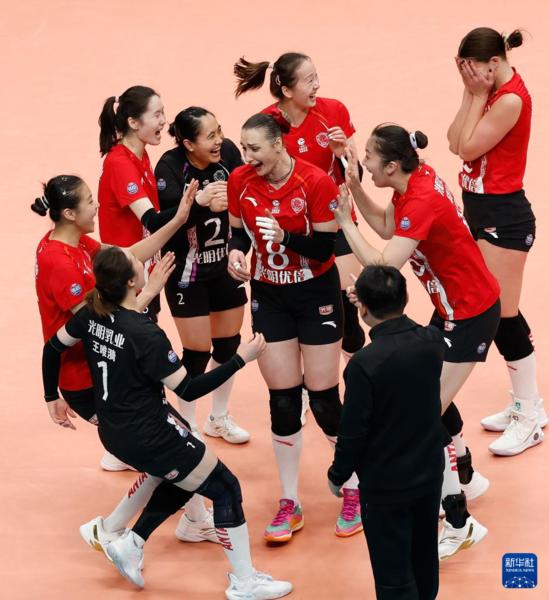 3月3日,上海光明优倍队王奥芊、王唯漪、许晓婷、朱星辰、沃隆科娃、仲慧、陈厚羽和范赖克(从左至右)庆祝最后一分挑战成功并取得比赛胜利。