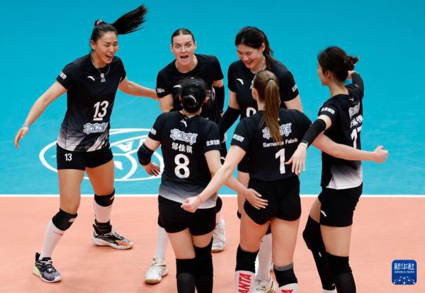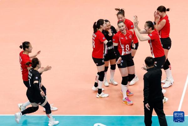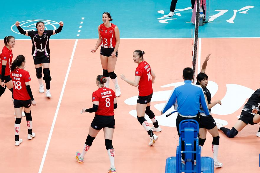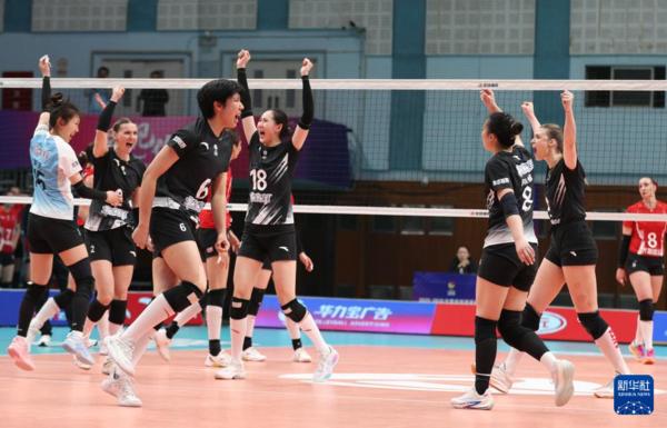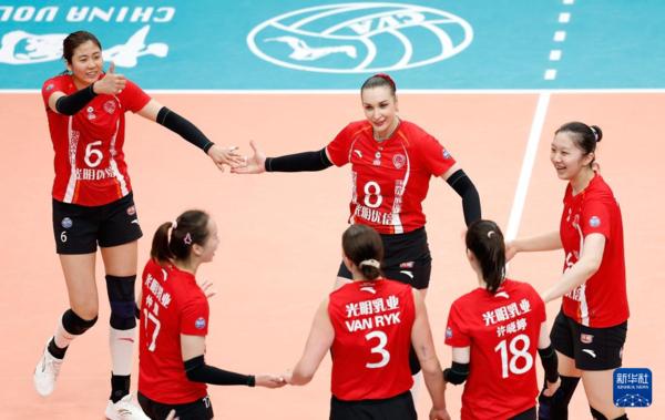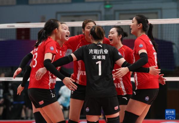 3月3日,上海光明优倍队球员高意(上左)、沃隆科娃(上中)在比赛中与队友庆祝得分。