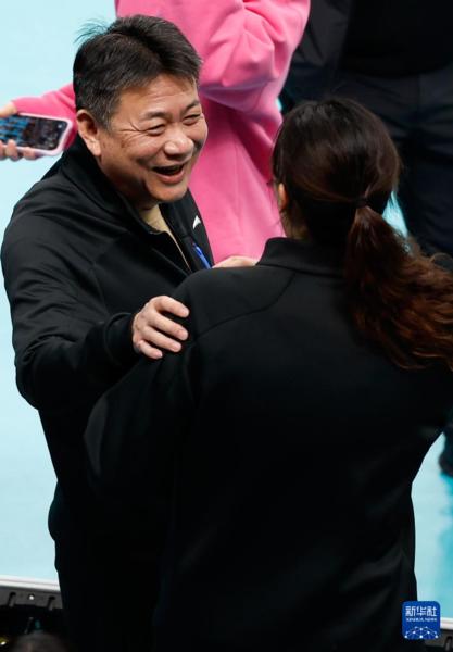 3月3日,上海光明优倍队主教练蔡斌(左)在比赛后与北京北冰洋队球员王云蕗交谈。