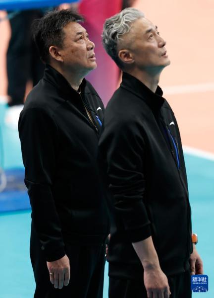 3月3日,上海光明优倍队主教练蔡斌(左)在比赛前奏唱国歌仪式中。