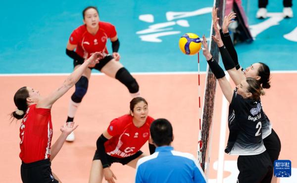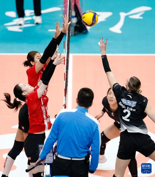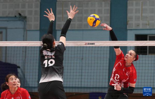 3月3日,北京北冰洋队球员金佳宝(左)在比赛中拦网上海光明优倍队球员沃隆科娃。