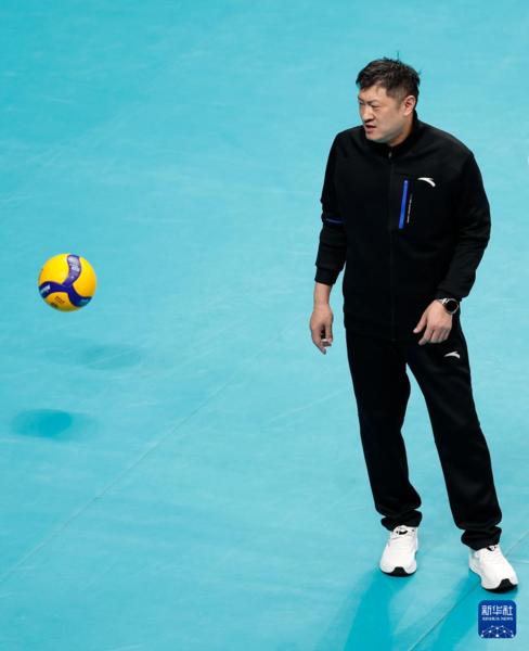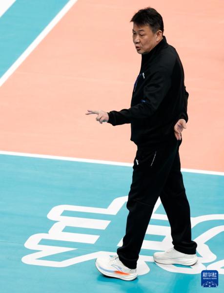 3月3日,上海光明优倍队主教练蔡斌在比赛中示意发球位置。