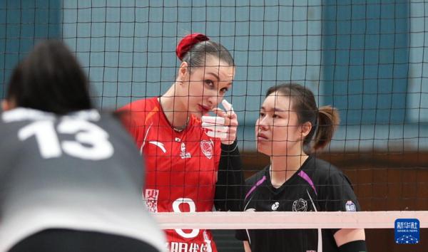 3月3日,上海光明优倍队球员沃隆科娃(左)和王唯漪在比赛中交流。