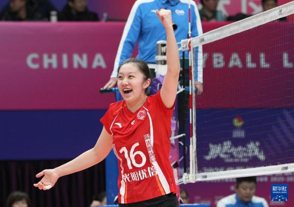 3月3日,上海光明优倍队球员在比赛中庆祝得分。