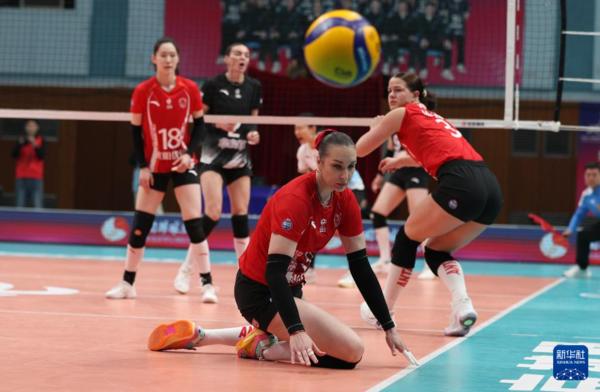 3月3日,上海光明优倍队球员沃隆科娃(中)在比赛中救球。