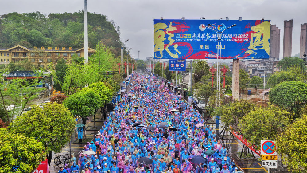 2026湘鄂龙凤马拉松11日在湖北恩施来凤县开赛,来自全国各地超万名跑者齐聚湖北来凤和湖南龙山,以一场跨省的奔跑,见证两地深厚情谊。
