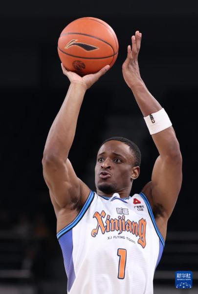 4月13日,新疆伊力特队球员纳托尔在比赛中投篮。