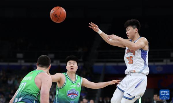 4月13日,新疆伊力特队球员葛浩然(右)在比赛中传球。